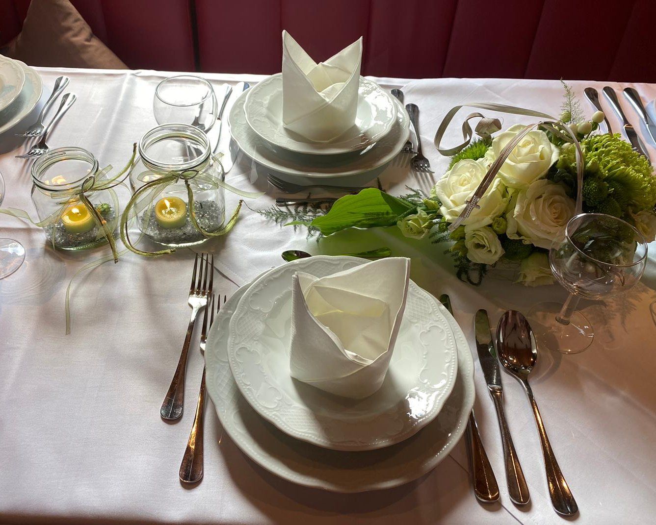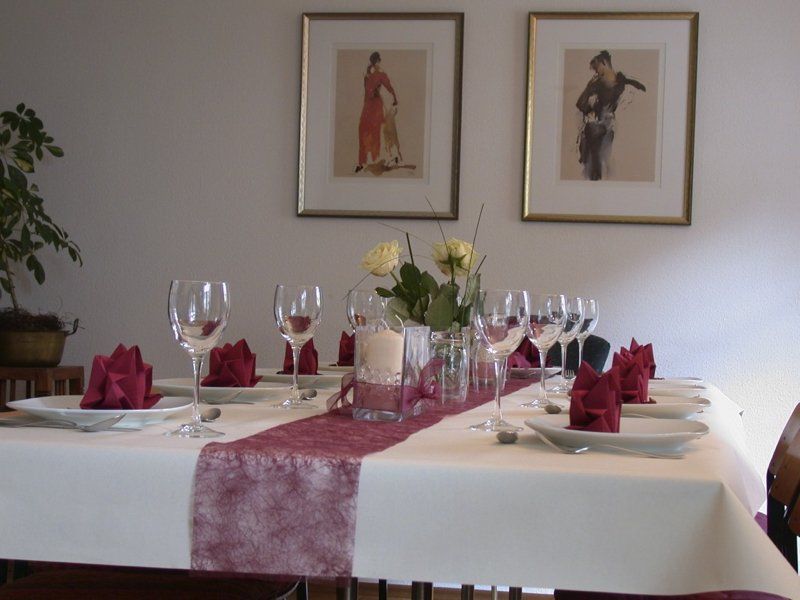 Auch können Sie bei mir Vasen, Windlichte, Kerzenständer usw. ausleihen sowie Tischläufer, Servietten und Kerzen dazu passend beziehen. Ich biete Ihnen das Rundum-Sorglos-Paket - damit Sie sich nur noch auf Ihr Fest freuen können.